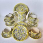 The set features a bright yellow base decorated with white and floral patterns, giving it a rich and artistic look.