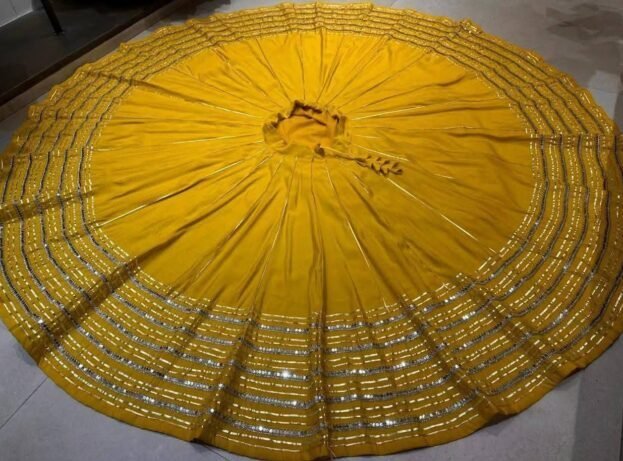 - Design: Traditional outfit featuring a wide, flared skirt (chaniya) adorned with eye-catching border work and possibly subtle embellishments like embroidery or lace.