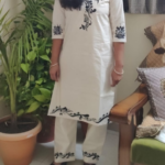 Yeh ek elegant white cotton kurta set hai jisme black color ka traditional handblock print work kiya gaya hai. Kurta ke neckline, sleeves aur border par designer floral print iska look aur bhi classy banata hai. Straight plazo pant par bhi matching block print diya gaya hai jo is outfit ko perfect coordinated look deta hai.