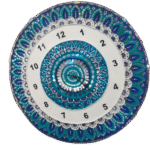 A beautiful hand painted mandala wall clock in shades of blue and white . The intricate circular patterns give it a peacock inspired look, making it a stunning piece of home decor.