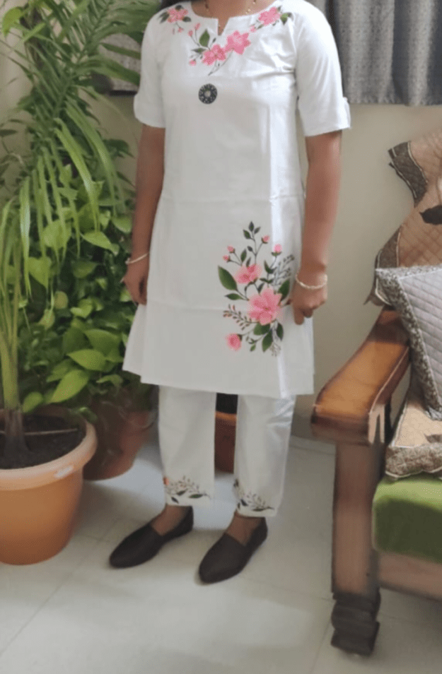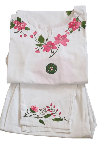 This beautifully crafted pure cotton suit set features elegant pink floral hand painting on the neckline and a matching design on the dupatta border. Lightweight and comfortable, it adds a graceful ethnic look perfect for casual outings, festive gatherings, and everyday wear.