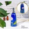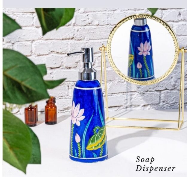 This elegant soap dispenser is handcrafted using traditional Jaipur blue pottery. Featuring a beautiful hand-painted floral and lotus motif on a rich blue base, it adds a touch of artistry and sophistication to your bathroom or wash area. The smooth glazed ceramic body is paired with a durable stainless steel pump for easy and hygienic use. Perfect for liquid soap, hand wash, or lotion, this dispenser blends functionality with timeless Indian craftsmanship and also makes a thoughtful gift.