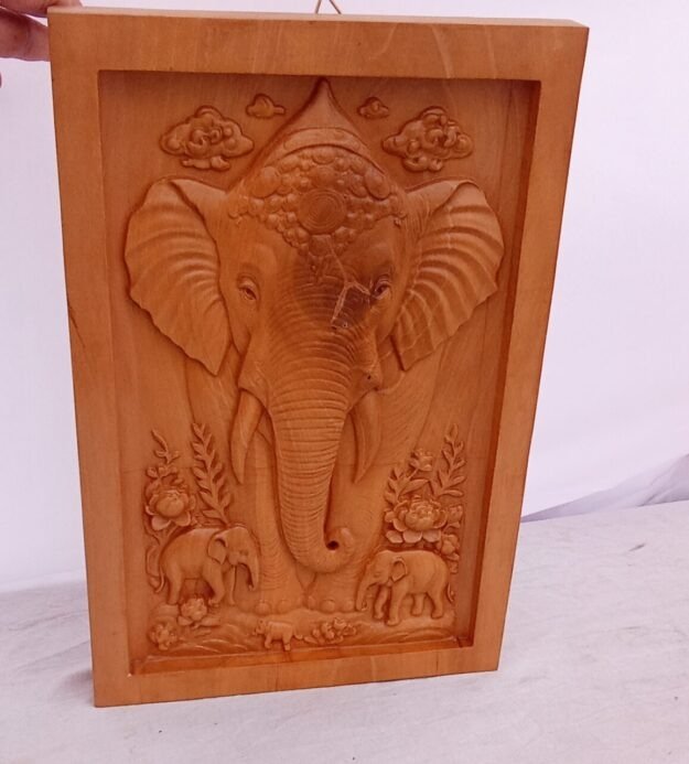 This beautifully hand-carved wooden wall panel features Lord Ganesha in an elegant and detailed design. Crafted from natural wood, the artwork showcases fine carving with a smooth finish, highlighting Ganesha’s serene expression along with decorative floral motifs and small elephant figures at the base. The warm wooden tone adds a traditional and spiritual touch, making it ideal for home décor, pooja rooms, offices, or as a thoughtful gift. This wall hanging symbolizes wisdom, prosperity, and good fortune, reflecting skilled Indian craftsmanship.