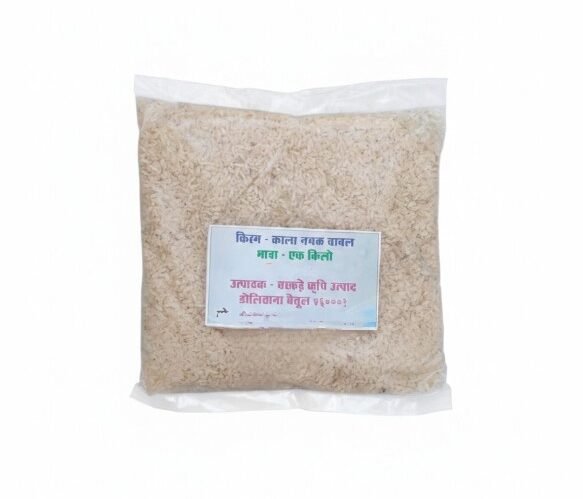 The product in the image is किरम काला नमक चावल (Kirm Kala Namak Chawal), which translates to Kirm Black Salt Rice. This name comes from the black husk (“kala” means black, and “namak” means salt) of the paddy, though the rice inside is typically a brownish or creamy white grain.