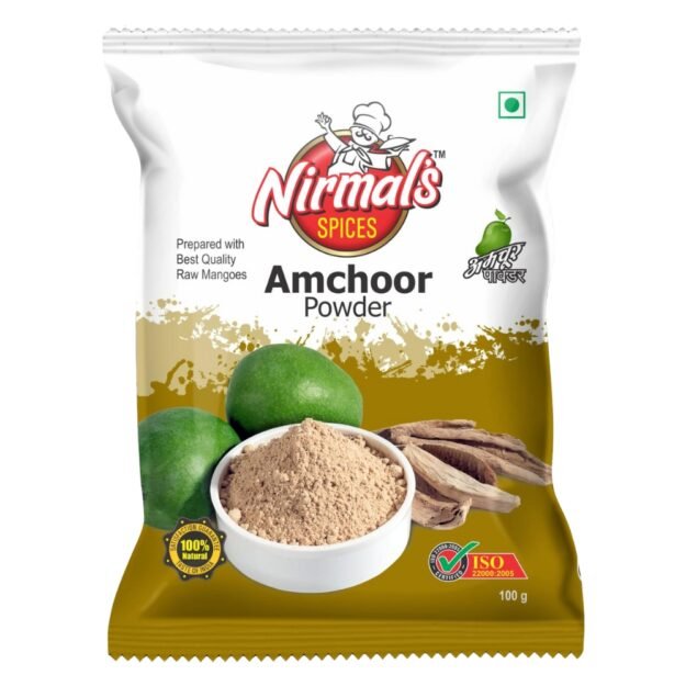 Nirmal’s Spices Amchoor Powder is a premium, 100% natural dried mango powder produced by Nirmal Industries in Madhya Pradesh, India. It is a tart, pale-beige powder used to add a tangy, sour-sweet flavor to curries, soups, salads, and snacks. Available in 50g and 100g pouches.