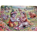 - They are interacting affectionately with a young calf, reflecting Krishna’s traditional role as a cowherd.